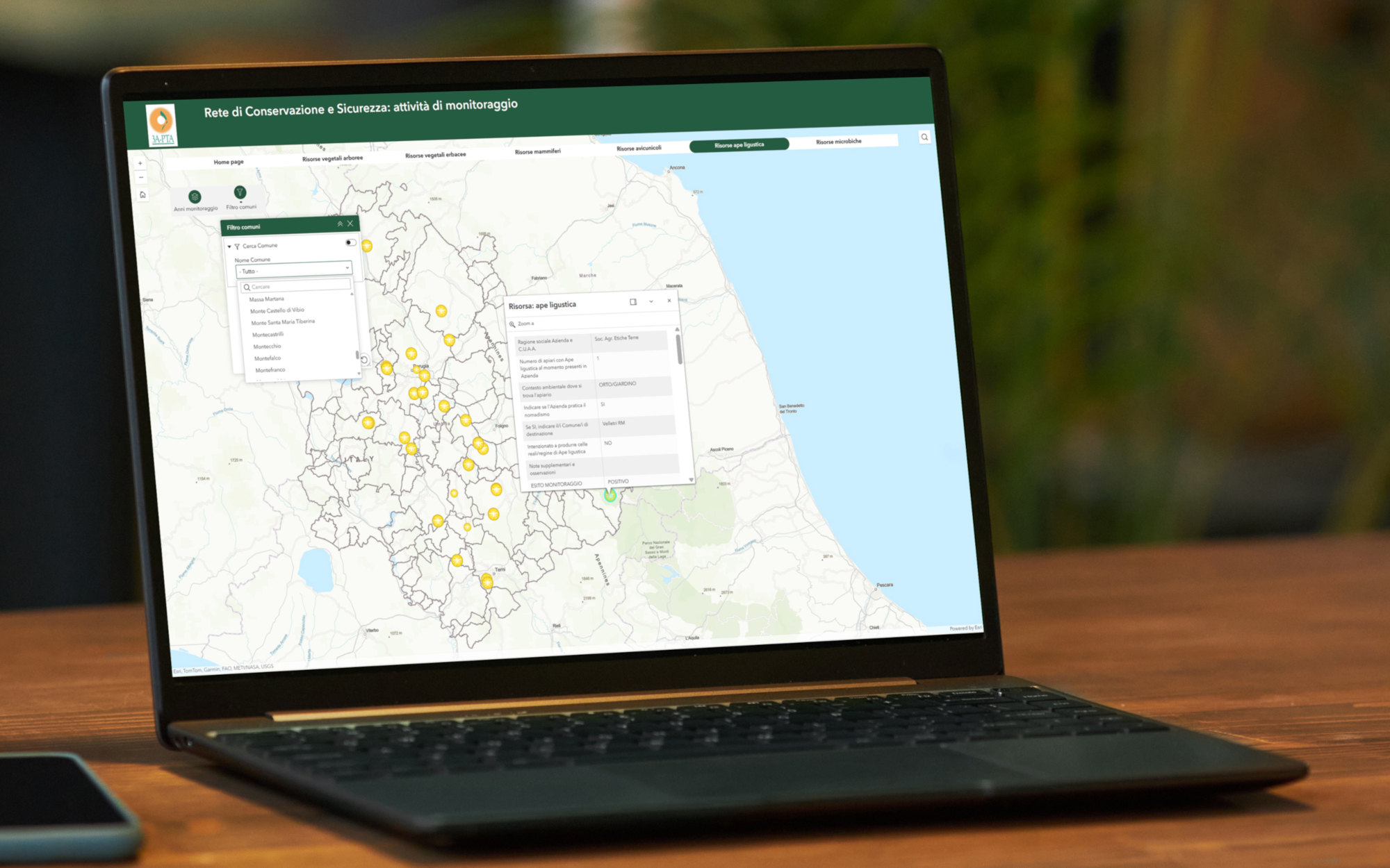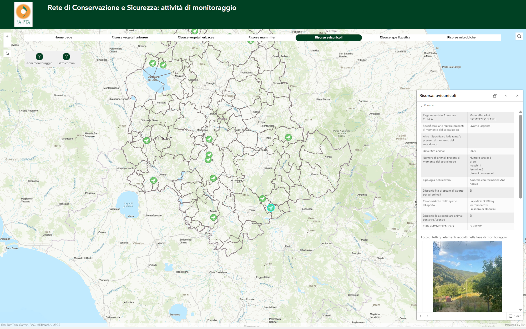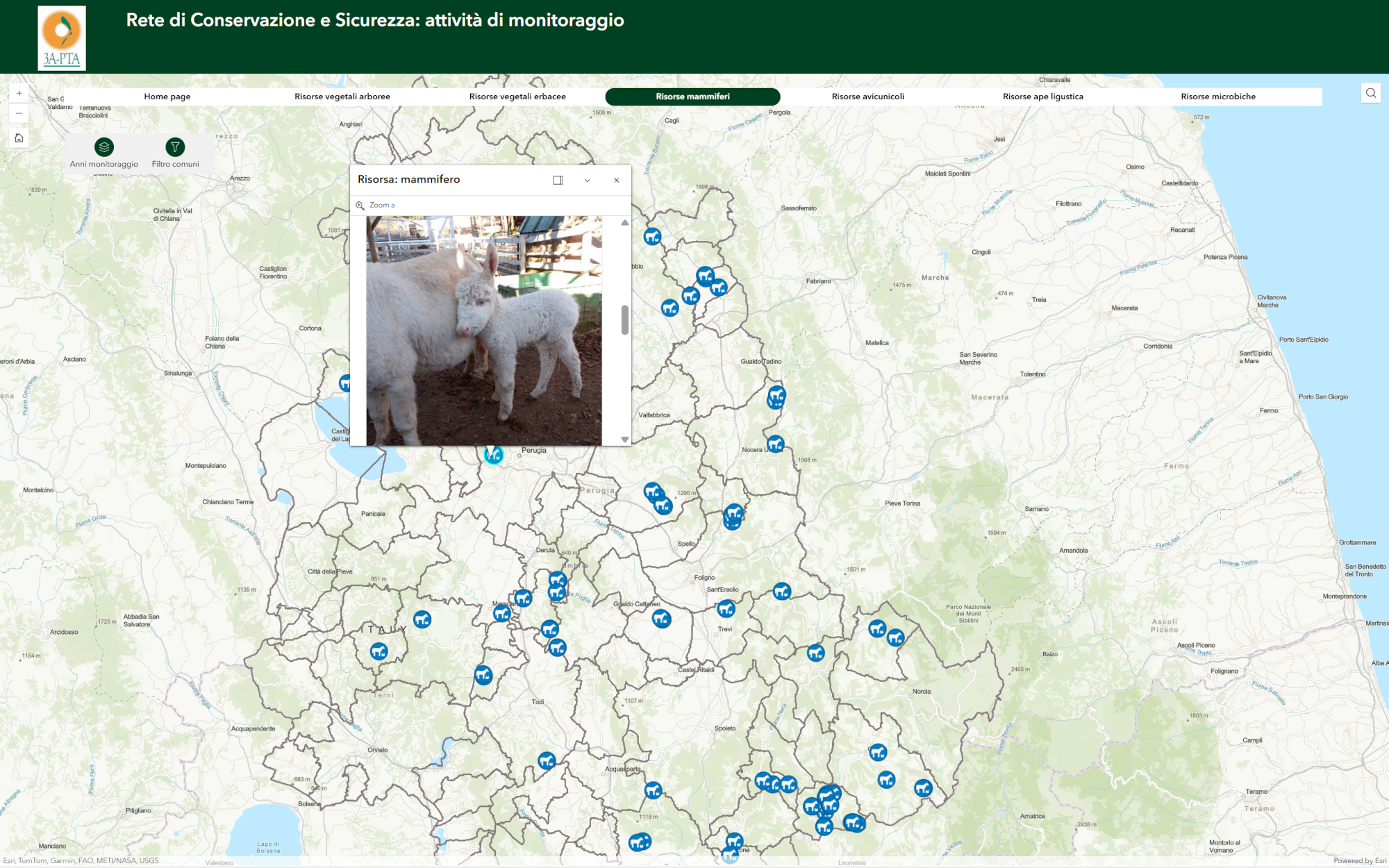 - Database georeferenziato: I dati vengono elaborati in una piattaforma (basata su tecnologia ArcGIS Experience) che permette di filtrare le informazioni per comune o tipologia di risorsa.